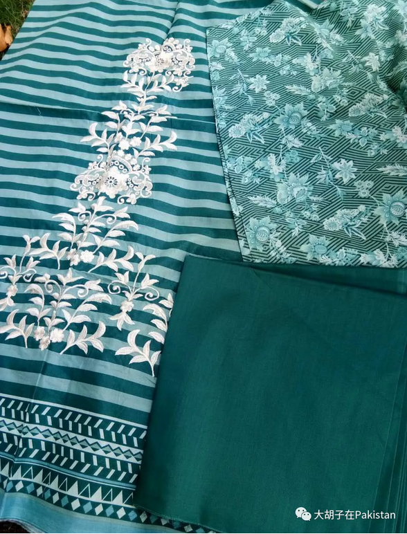 第一套:Khaadi, 衣服2.5m, 裤子是黑色的,2.5m。色彩鲜明,薄而不透。水洗不掉色。肩膀上的花是刺绣上去的,价格超值290这么一套。