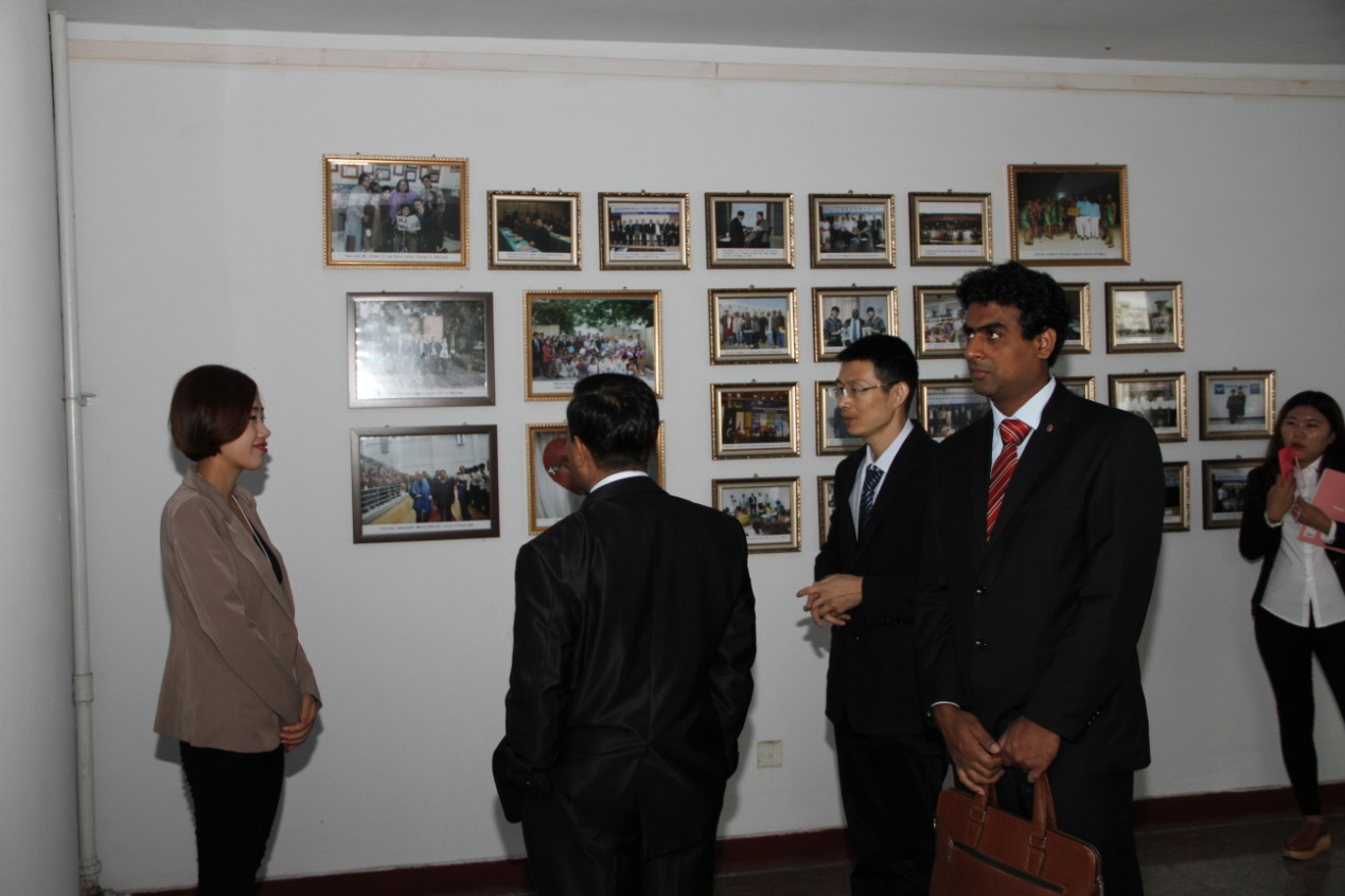 首先是我带领教育参赞参观了我院地坤楼和留学生公寓并进行英文讲解。在地坤楼,解释了楼的设计和各个楼层的用处以及墙的两侧的图片。