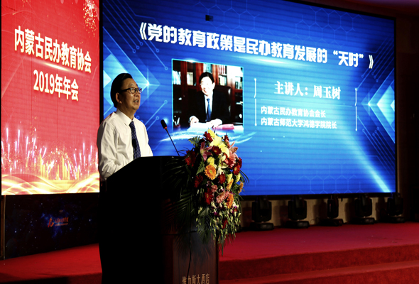 会上,内蒙古民办教育协会会长、内蒙古师范大学鸿德学院院长周玉树以《党的教育政策是民办教育发展的“天时”》为题做了报告。他首先回顾了内蒙古民办教育发展的几个阶段,然后分析了目前民办教育的政策,最后指出民办学校要特别重视安全工作。