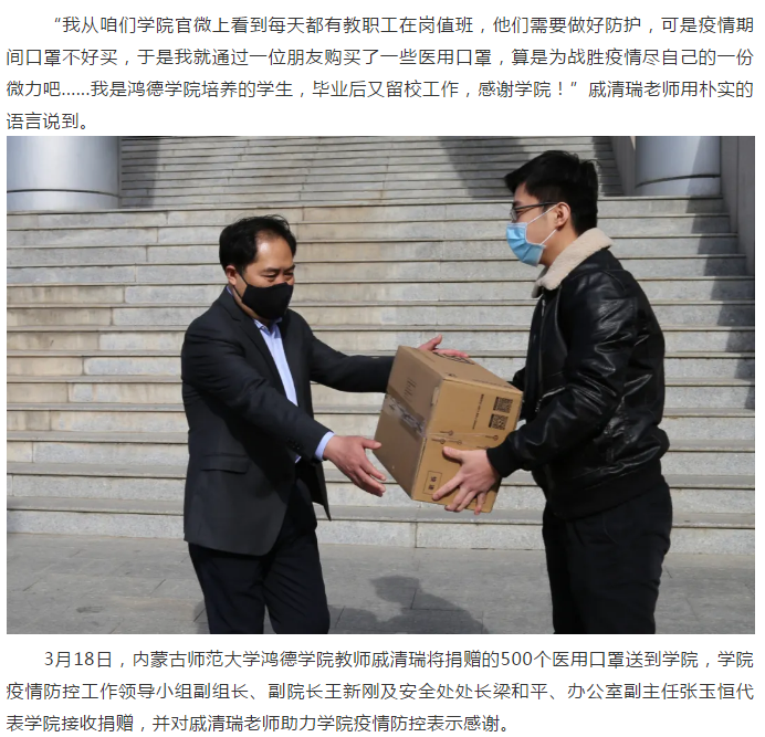内师大鸿德学院毕业留校工作教师戚清瑞向母校捐赠医用口罩