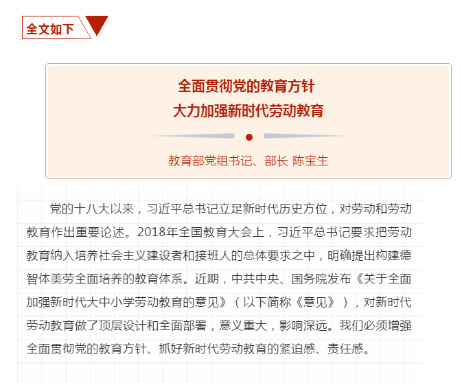 教育部部长陈宝生:全面贯彻党的教育方针、大力加强新时代劳动教育