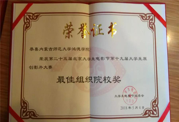 今天,继去年之后又一次摘得了北京大学生电影节最佳组织院校奖,再次蝉联这一殊荣,体现出了我院广播电视编导专业在学生专业人才培养方面的显著成果。此次获奖极大地调动了学生的积极性,也将大大提升内蒙古师范大学鸿德学院在全国影视类院校中的影响力和美誉度。
