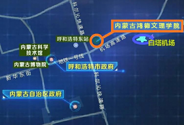学院东临白塔机场,西接火车东站,南北两侧紧挨地铁1号线和京呼高铁,交通非常便利。学院与内蒙古博物院、乌兰恰特大剧院、内蒙古科技馆毗邻,处于呼和浩特市文化中心,是距离自治区政府和呼和浩特市政府最近的高校。